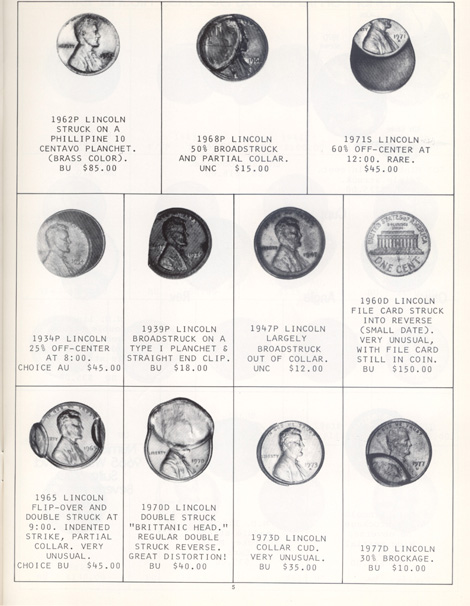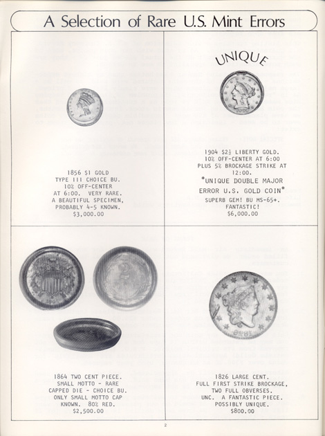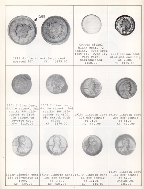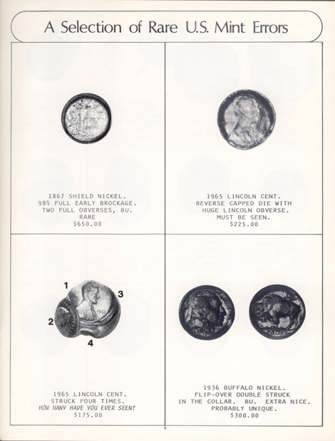 Here is another in a series of Mint Error Catalogs from Fred Weinberg when he was with Numismatics, Ltd. It is always exciting to compare current mint error prices with those from decades ago. Mint Error News Magazine thanks Fred Weinberg for sharing these with our readers.