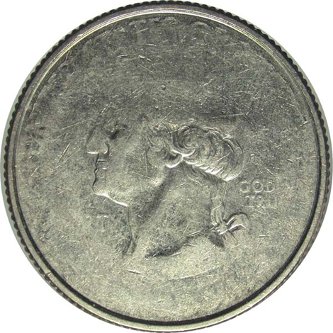 PHOTO #8: Obverse of a State Quarter struck through grease. Note the resemblance to a die adjustment strike, except the reeded edge is full. Struck thrus can also affect just one side of a coin, while a die adjustment strike will show weakness on both.