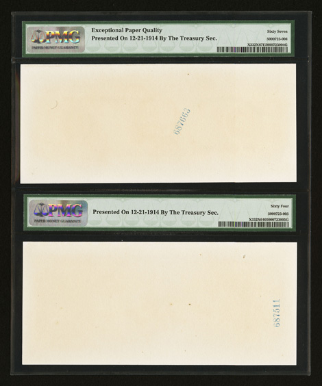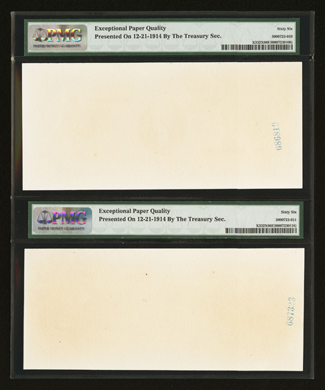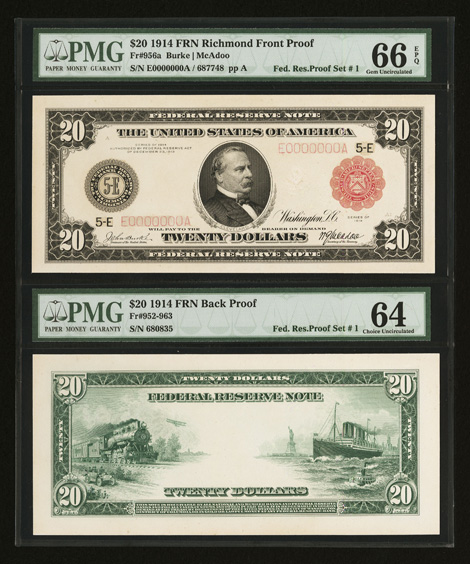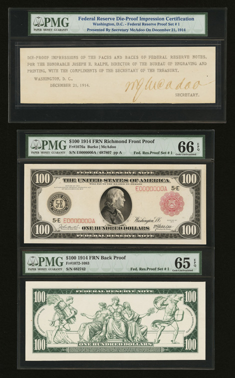Ten Note Federal Reserve Proof Presentation Set Number 1, Presented by Secretary of the Treasury William G. Mc Adoo on December 21, 1914 On December 23, 1913, President Woodrow Wilson signed into law the Federal Reserve Act, which transformed the American monetary system and is now about to celebrate its one hundredth birthday. Soon thereafter, Joseph E. Ralph, the Director of the Bureau of Engraving and Printing, was assigned the task of designing and producing the new Federal Reserve Notes. During the next year, various prototype designs were produced until a standardized design was finalized in the Fall of 1914. As a part of the design process, a small quantity of Proof examples was produced. These Proofs were printed from the actual currency plates on to card stock, with the Treasury seal and the all zero serial numbers glued on by hand by the pressman. On the back of each Proof the official “Proofing Room” number was imprinted in light blue ink.