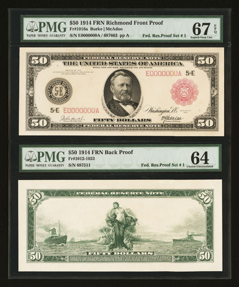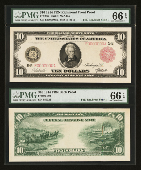 The set consists of ten pieces, a Richmond district front of each of the five denominations along with a back for each of the five denominations. All have been encapsulated in custom holders and graded by PMG, with the grades of each as follows: $5 Front Proof Gem Uncirculated 66 EPQ, $5 Back Proof Superb Gem 67 EPQ, $10 Face Proof Gem Uncirculated 66 EPQ, $10 Back Proof Gem Uncirculated 66 EPQ, $20 Face Proof Gem Uncirculated 66 EPQ, $20 Back Proof Choice Uncirculated 64, $50 Face Proof Superb Gem Uncirculated 67 EPQ, $50 Back Proof Choice Uncirculated 64, $100 Face Proof Gem Uncirculated 66 EPQ, $100 Back Proof Gem Uncirculated 65 EPQ.