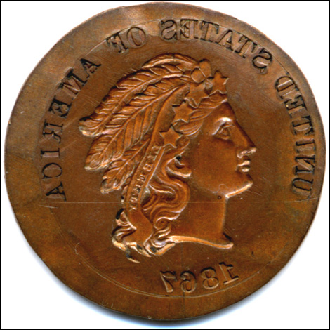 This is part of the design for the obverse of the aluminum 5 Cent pattern. Longacre was already well known because he had designed so many U.S. coins that were in current production: the Indian Head Cent, the 2 Cent piece, the 3 Cent piece, the Shield Nickel and the $20.00 Gold piece were all designed by him. For the obverse of his aluminum 5 Cent pattern he adorned a youthful Head of Liberty with a headdress possessing 4 feathers, 4 stars and a ribbon inscribed with the words UNION & LIBERTY. Around the head were the words UNITED STATES OF AMERICA, and below the head was the date, 1867. The aluminum pattern was struck with a plain edge (Judd 561, Pollock 622) or a reeded edge (Judd 562, Pollock 623), and came to be known as the “Indian Princess” pattern.