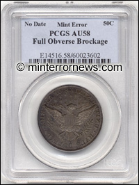 This is one of the most spectacular major mint errors that I have ever had the pleasure of handling. It is a unique first strike full mirror brockage Barber Half. It is the only known Barber Half brockage for the entire series. It is almost uncirculated with original luster and beautiful toning.