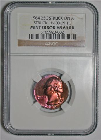 Double Denomination U.S. mint errors are very popular and in great demand by mint error collectors. Here is a trio of 1964 Quarters, stuck on a struck Nickel, Cent and Dime. They are all in gem condition and show much detail of the understrike.