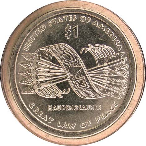 2010 Native American $1 Coin, Great Law of Peace, reverse, missing edge lettering.