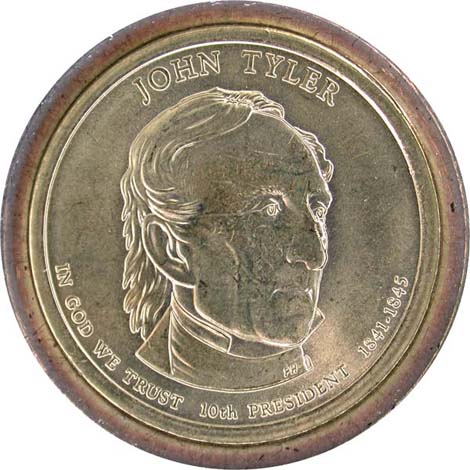 John Tyler Dollar from Mint Set, obverse, missing edge lettering.