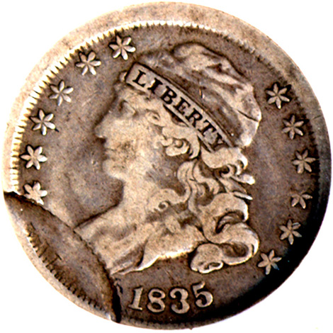 This is a very unusual 1835 bust dime. The obverse shows an indentation (brockage) from an already-struck bust dime at the 7:30 clock position.