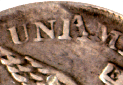 On the reverse, directly behind this indentation, the letters AMERI from the reverse die are situated exactly where the letters TED ST of UNITED STATES ought to be, creating the composite word UNIAMERIATES.