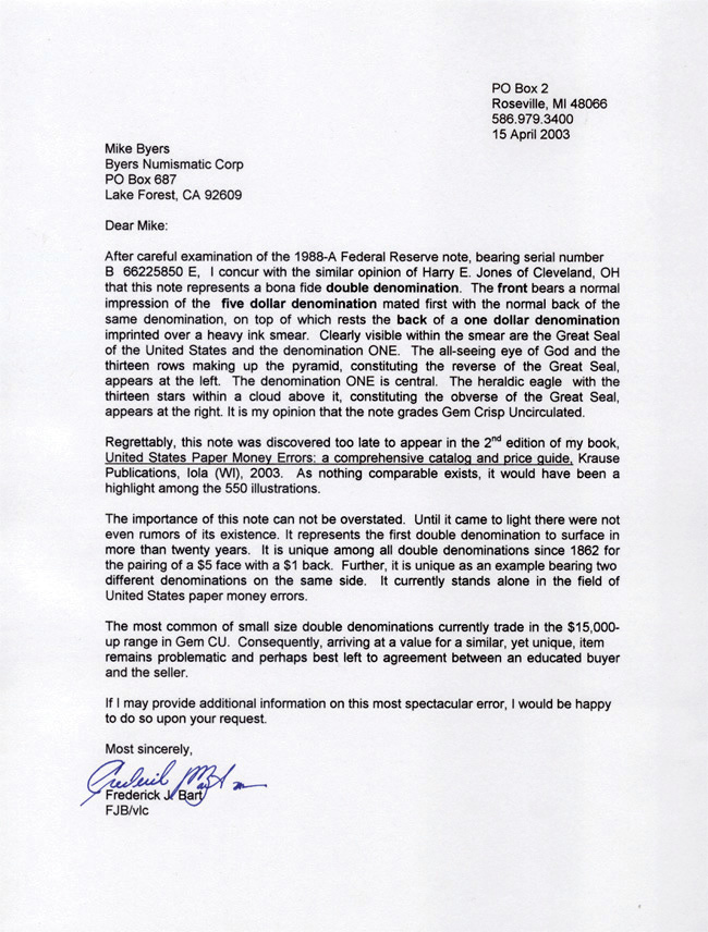 Below is an authentication letter from Frederick Bart for this unique discovery double denomination error. Frederick Bart is the author of United States Paper Money Errors: a comprehensive catalog and price guide.