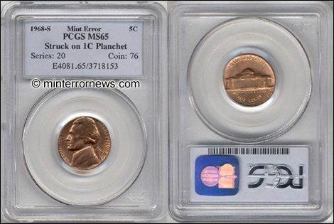 Included in this collection was a batch of mint state off-metals struck in the San Fransisco Mint from 1965 through 1970. Several of these dates are extremely rare. The 1965 and 1966 Cents are struck on clad Dime blanks which were intended for the striking of the Special Mint Sets. The 1968-S Cent are struck on clad Dime blanks which were intended for the striking of Proof coins. The 1968-S and 1970-S Nickels struck on Cent blanks are extremely rare.