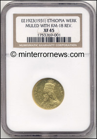 This gold mule is from Ethiopia and is unlisted. Somehow the obverse die which struck (1931) Werks was muled to the reverse of KM-18. The dies were not aligned properly and the reverse die was also rotated. A spectacular and unique major mint error.