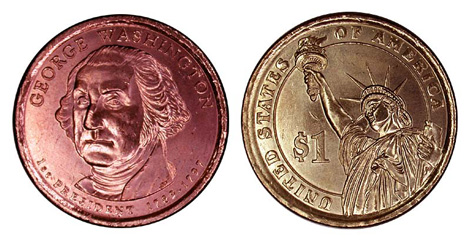 Photo #1c: Two George Washington $1 Coins, edge view, showing opposite orientations of edge lettering. At left the edge is read with obverse up, at right the edge lettering is properly oriented with reverse facing up.