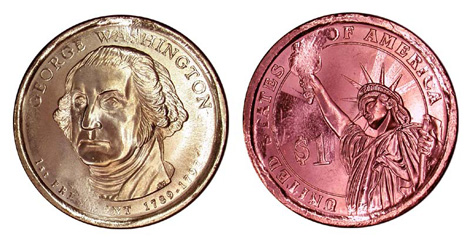 In addition to edge lettering errors, other error types have also surfaced. The Washington dollars are composed of the same three-part clad layers as the Sacagawea dollars, and similarly missing clad layers exist. Planchets missing layers are thinner that normal planchets and, therefore, these errors show a noticeable weakness in the design especially along the edge of the coin. These errors can be dramatic because the pure copper center of the coin is exposed. This bright red is a sharp contrast to the “golden” appearance on the other side of the coin. Here are photos of missing clad layers: