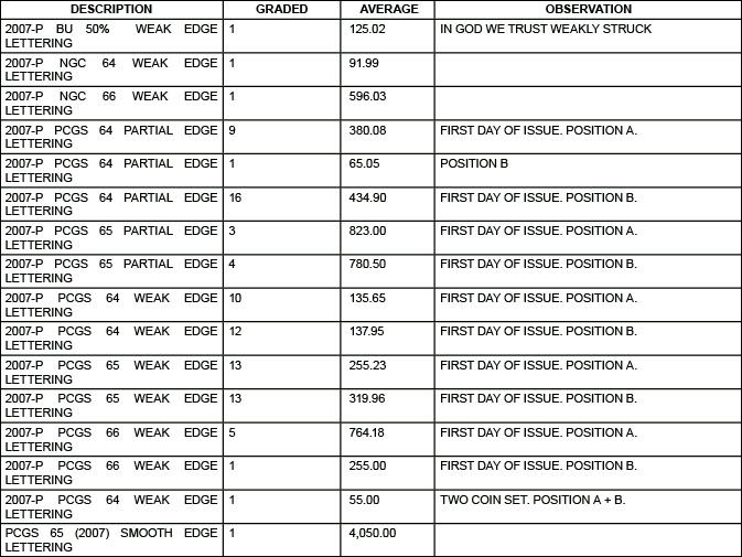 Here are records of recent sales of George Washington, John Adams, Thomas Jefferson and James Madison Presidential Dollar mint errors on eBay from October 1, 2007 to December 31, 2007.