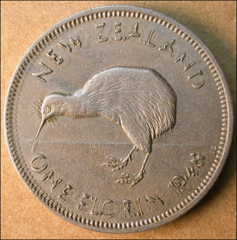 Figure 2a - Reverse face of a double-struck 1948 New Zealand 1 florin coin with a rotation of the hammer die on the second strike.
