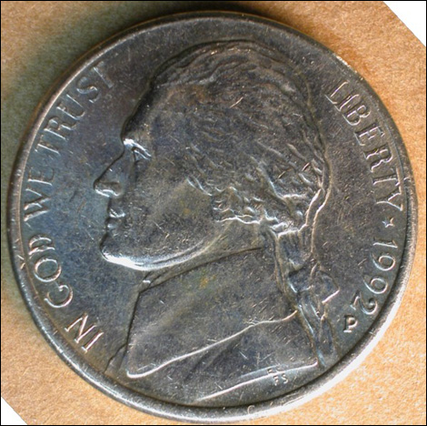 Figure 3a - A 1992-P nickel with severe machine doubling (“push doubling” subtype) on the obverse face. Coin acquired from Mark Westcott.