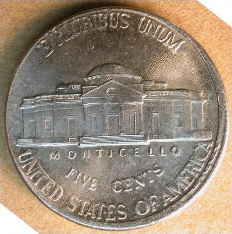 Figure 5a - Reverse face of a 1999-P nickel showing a very clear stutter strike in the southeast quadrant. Coin acquired from Charles Rickard.
