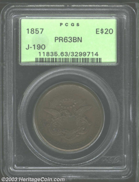 1857 E$20 Twenty Dollar, Judd-190, Pollock-3158, Unique(?), PR63 Brown PCGS