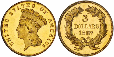1887 Three-Dollar Gold. Triple-Struck. Rotated in Collar. NGC graded Proof 64. Cameo.