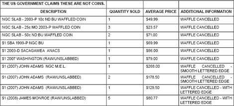 THE US GOVERNMENT CLAIMS THESE ARE NOT COINS. WAFFLED COINS ARE THE MATERIAL DESTINED FOR RECYCLING BACK TO THE MANUFACTURER. CONDEMNED COIN BINS OR FLOOR SWEPT MATERIAL COMPRISE OF THESE COINS. WAFFLED ERRORS BRING SUBSTANTIALLY HIGHER PRICES THAN ANY THAT SHOW NO ERROR. MANY OF THESE CENT THROUGH DOLLAR SLABBED WAFFLES ARE SHOWING UP AT THE MAJOR SHOWS AND EASILY TRADED.