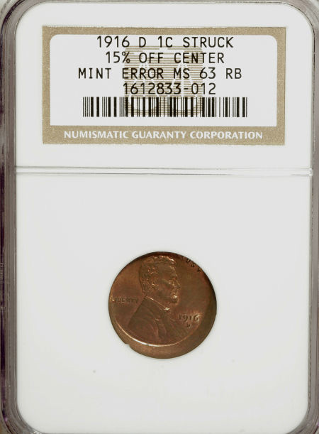 1916-D 1C Lincoln Cent--Struck 15% Off Center--MS63 Red and Brown NGC