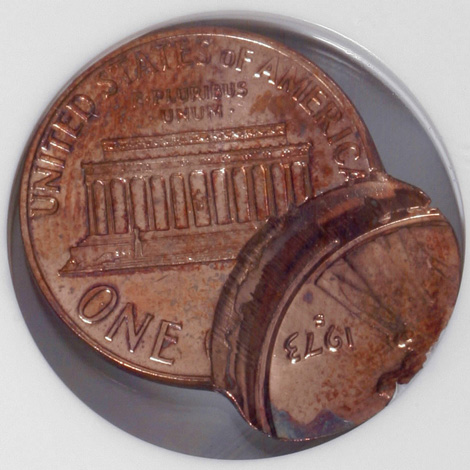 1973-S 1C--Double Struck, Flipover 2nd Strike 60% Off-Center--MS64 Red and Brown NGC