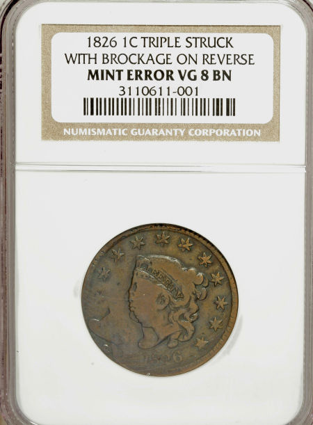 1826 Large Cent 1C --Triple Struck with Brockage on Reverse--VG8 NGC