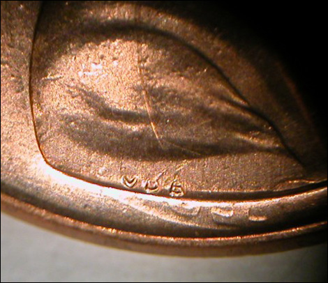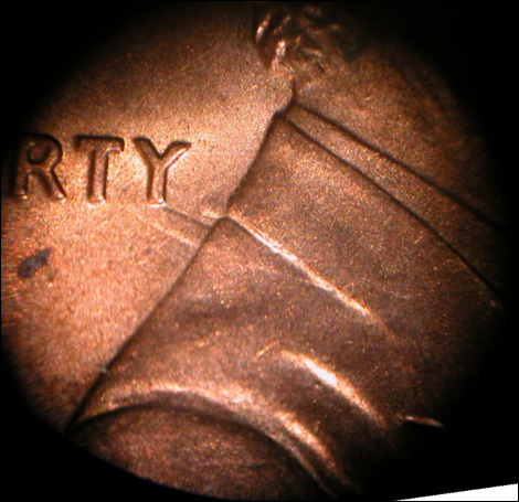 Figure 9. A 1999 cent with a misaligned and tilted die clash to the left of Lincoln’s coat. Coin courtesy of G.J. Lawson.