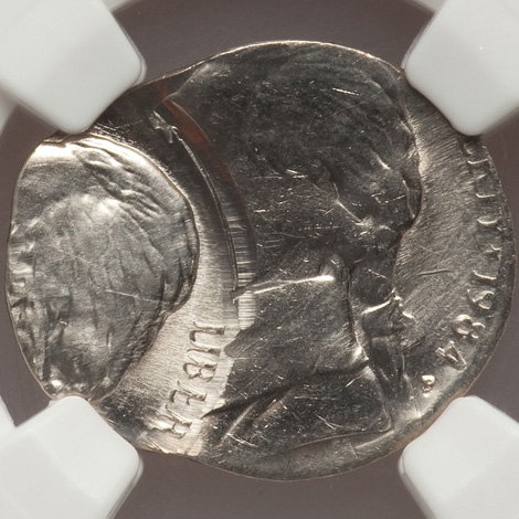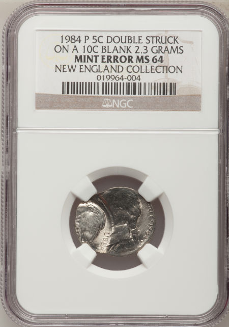 1984-P 5C Jefferson Nickel--Double Struck on a Clad Dime Blank--MS64 NGC