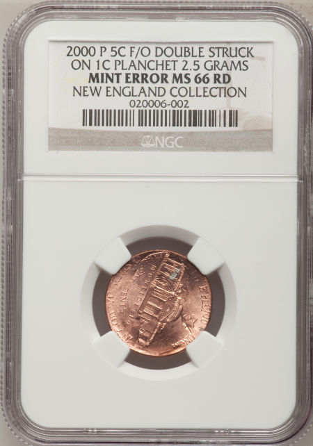 2000-P 5C Jefferson Nickel--Flipover Double Struck on a Cent Planchet--MS66 Red NGC