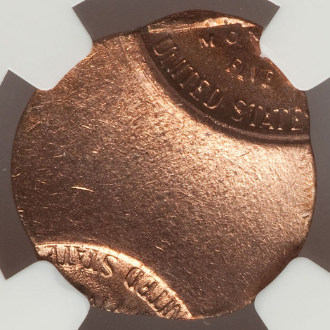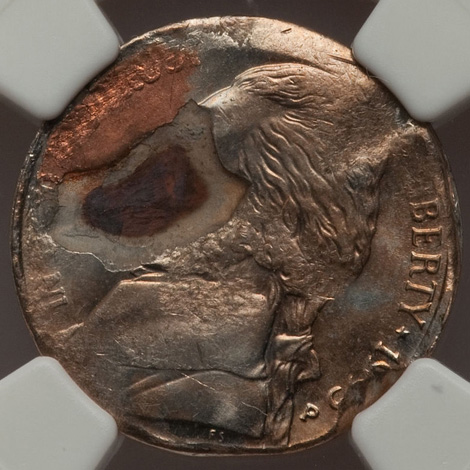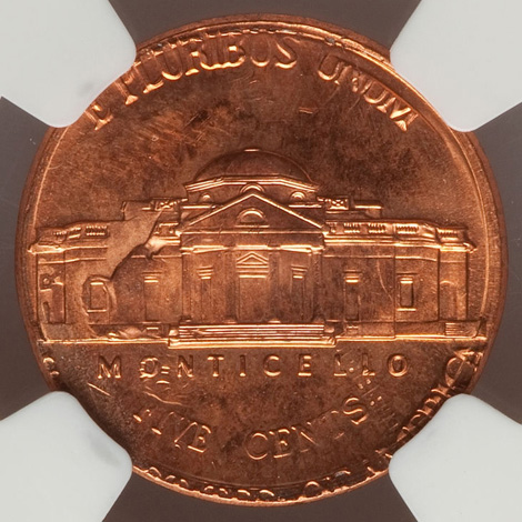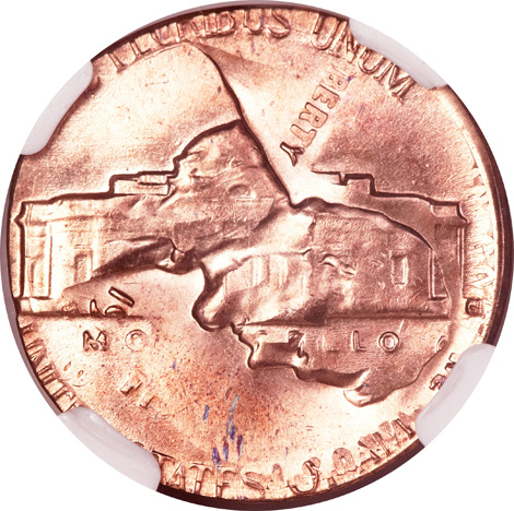 Undated Jefferson Nickel--Struck 50% Off Center on a Defective Cent Planchet--MS63 Red and Brown NGC