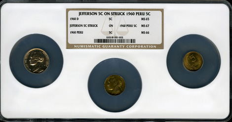 Undated Jefferson Nickel--Struck on a 1960 Peru 5 Centavos--MS67 NGC