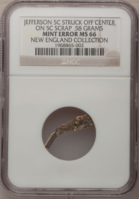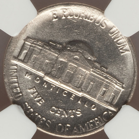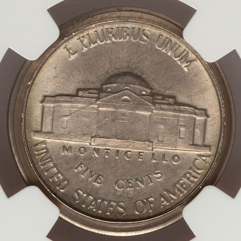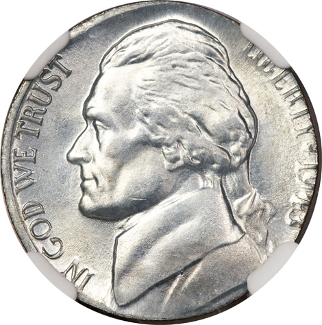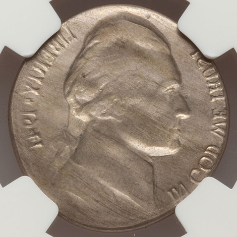 Undated Jefferson Nickel--Struck Off Center on Copper-Nickel Alloy Scrap--MS66 NGC