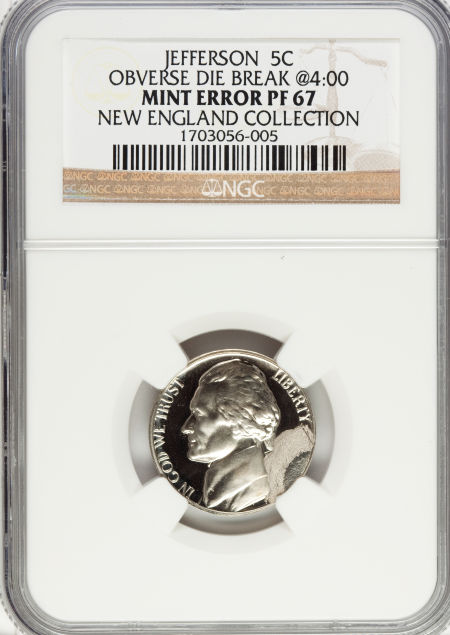 Undated Jefferson Nickel--Obverse Die Break at 4:00--PR67 NGC