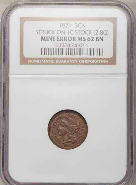 1871 Three Cent Nickel--Struck on Cent Stock--MS62 Brown NGC