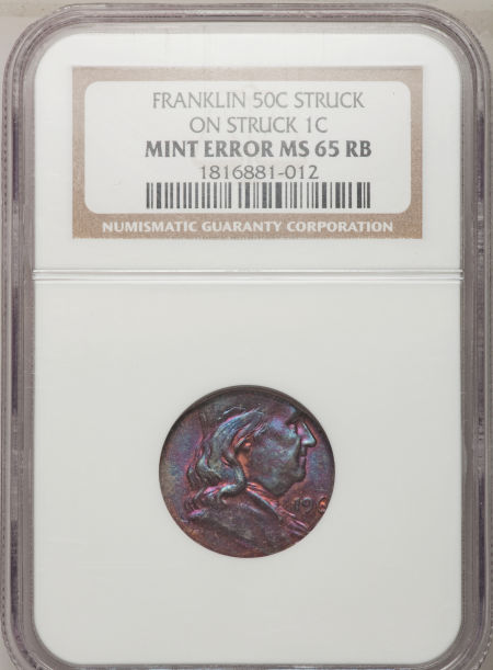 196?-D 50C Franklin Half--Struck on a Struck Cent--MS65 Red and Brown NGC