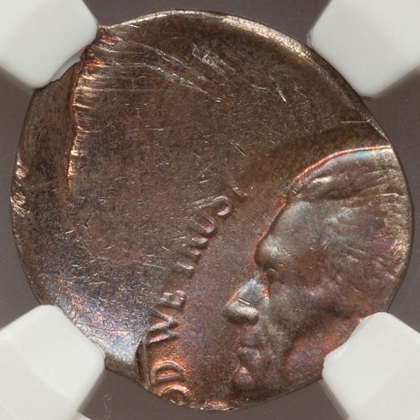 Undated Jefferson Nickel--Double Struck, Saddle Struck on a Cent Blank--MS64 Red NGC