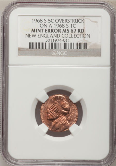 1968-S 5C Jefferson Nickel--Struck on a 1968-S Cent--MS67 Red NGC