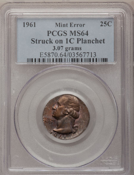 1961 Washington Quarter--Struck on Cent Planchet--MS64 PCGS