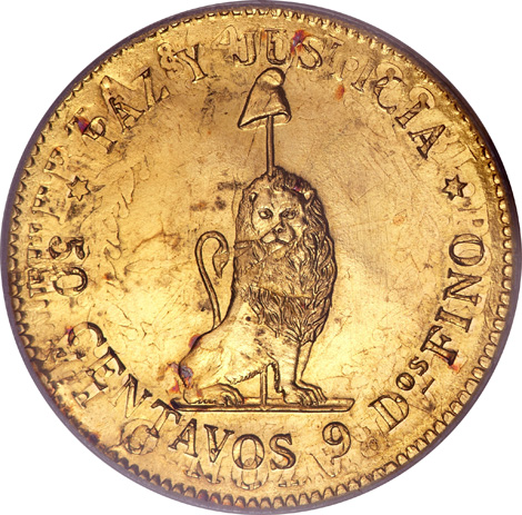 Republic Gold Pattern 50 Centavos 18-- Struck Over a Chile 1833 4 Escudos MS64 PCGS
