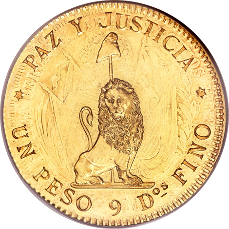 Republic Gold Pattern Peso 18-- Struck Over an 1863 Peru 20 Soles MS65 PCGS