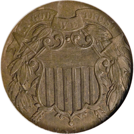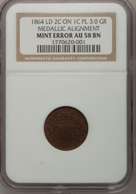 1864 Large Motto Two Cent Piece--Struck on a Bronze Cent Planchet, Medallic Alignment--AU58 NGC
