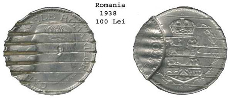 The two Romanian coins featured below had all the ear-marks of being mint errors (partial brockages). Obviously the coins had been defaced. My assumption was that the heavy lines were the result of the Mint destruction of mis-struck coins.