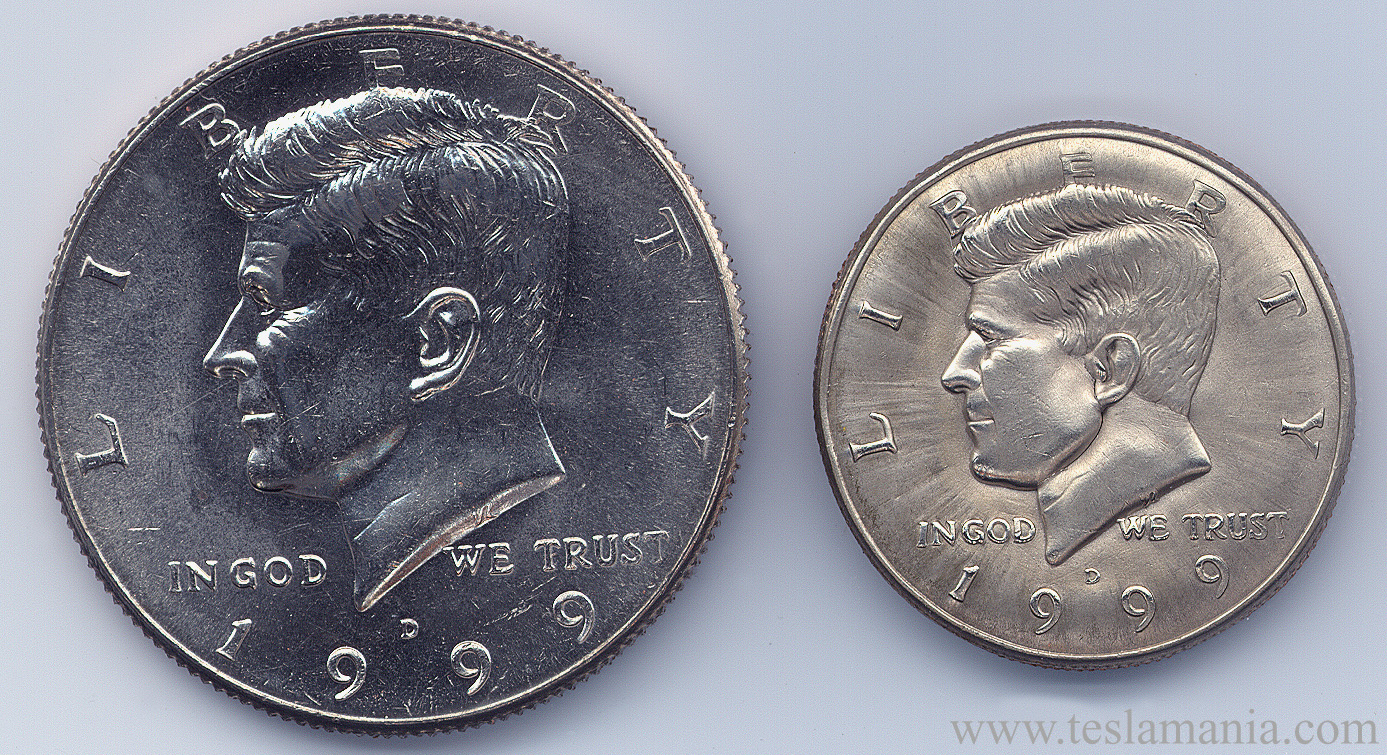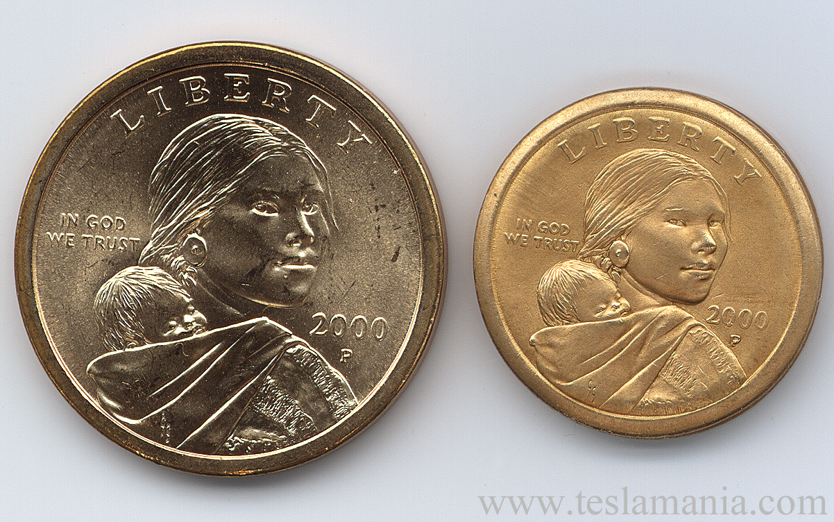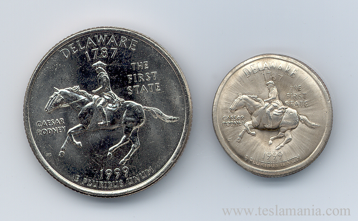 Shrunken coins are genuine coins that have been reduced to 65-95% of their original diameter using huge magnetic fields. Over the last year, we began offering shrunken coins as educational, scientific, and coin collecting novelties. A significant number of these are now in the hands of experimenters and collectors throughout the world. Shrunken coins have been featured in Coin World (November 25, 2002) and in the January-March, 2003 issue of Extraordinary Technology magazine. This article will briefly explain how these unique coins are produced and how they can be recognized so that they won’t be confused with true error coins.