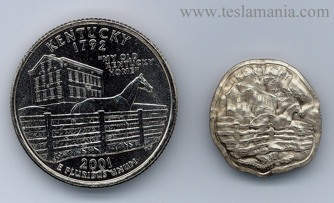 The magnetic fields of the coil and the coin violently repel each other, resulting in almost unimaginable forces that easily overcome the yield strength of the metal in the coin. These forces evenly squeeze the coin inward, almost instantly shrinking it into a smaller diameter while simultaneously causing it to become thicker. These same forces also drive the coil outwards, causing it to explode in a potentially deadly spray of high velocity wire fragments. All this takes place in about 20 millionths of a second, and is accompanied by a bright blue-white flash and a loud BANG! When the dust settles, a hot and shrunken coin rests at the bottom of the chamber. Amazingly, the features of a shrunken coin are fully preserved in spite of its explosive birth.