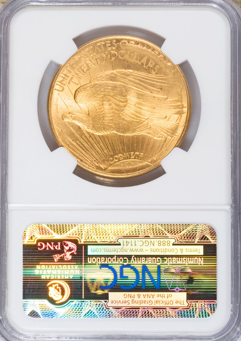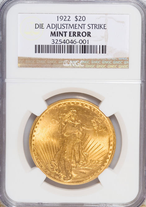 1922 $20 Saint-Gaudens Double Eagle--Die Adjustment Strike--NGC. The NGC insert omits a grade, but we suggest MS63 or finer, since practically all of the wispy abrasions present on the coin were on the planchet prior to the strike. Weakly brought up on the high points and along the borders. Nonetheless fully lustrous, and free from the bagmarks that plague nearly all survivors repatriated from foreign bank holdings.