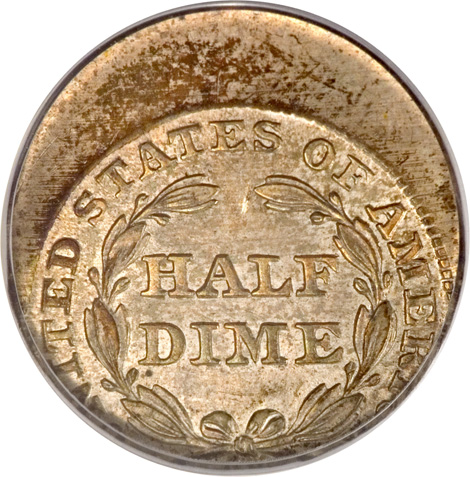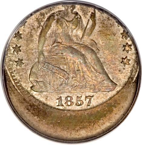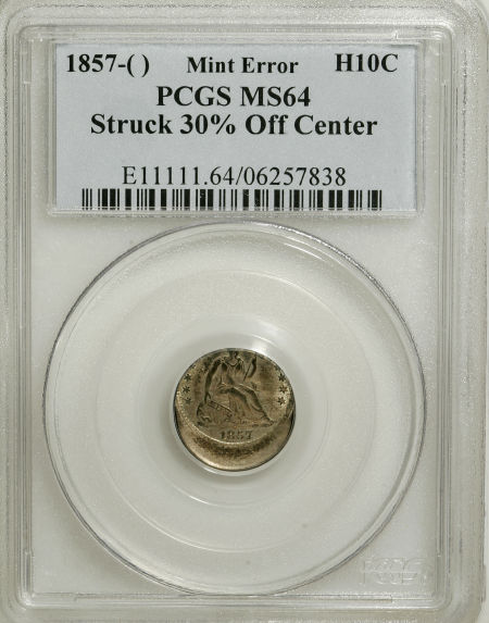 1857 H10C Seated Half Dime--Struck 30% Off Center--MS64 PCGS