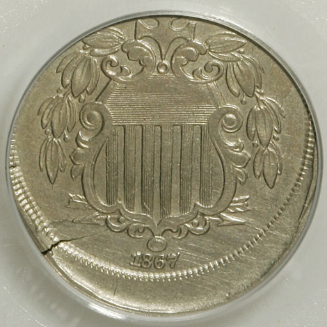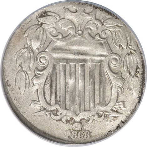 1868 5CN Shield Nickel--Struck on a Three Cent Nickel Planchet--Environmental Damage, Edge Damage--NCS. AU Details
