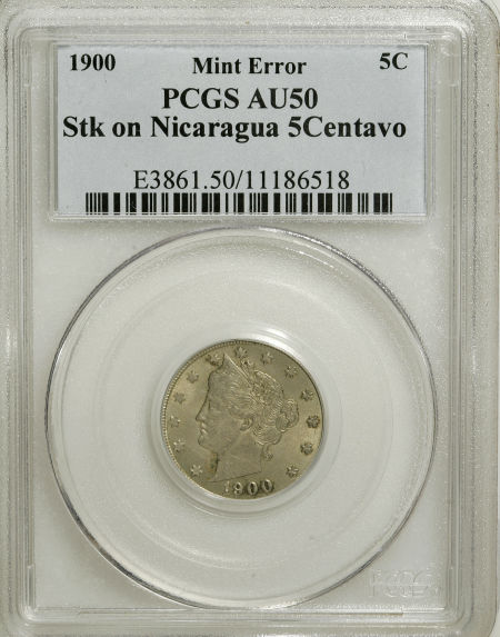 1900 5C Liberty Nickel--Struck on a Nicaragua Five Centavos Planchet--AU50 PCGS