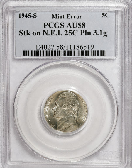1945-S 5C Jefferson Nickel--Struck on Netherlands East Indies 25 Cents Planchet. 3.1 Grams-- AU58 PCGS