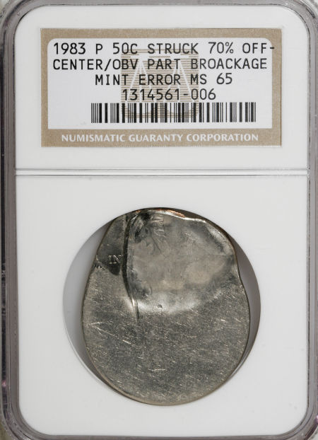 1983-P 50C Kennedy Half Dollar--Struck 70% Off-Center, Obverse Partial Brockage--MS65 NGC